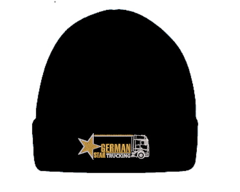 Schwarze Mütze mit gesticktem goldenen Stern, LKW-Motiv und dem Schriftzug "GERMAN STAR TRUCKING".