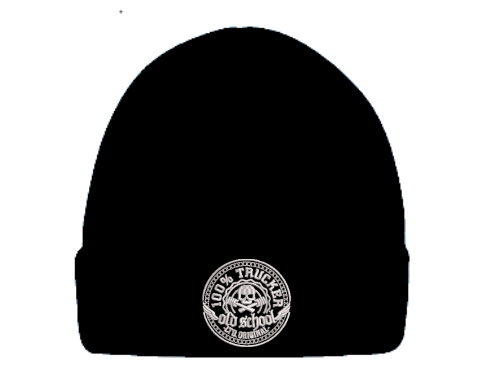 Schwarze Mütze mit gesticktem weißem Motiv: '100% TRUCKER old school the original' und Totenkopf.
