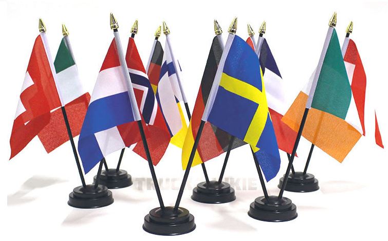 Kleine Flaggen für Tischständer, darunter die Niederlande, EU und Schweden, auf schwarzem Fuß.