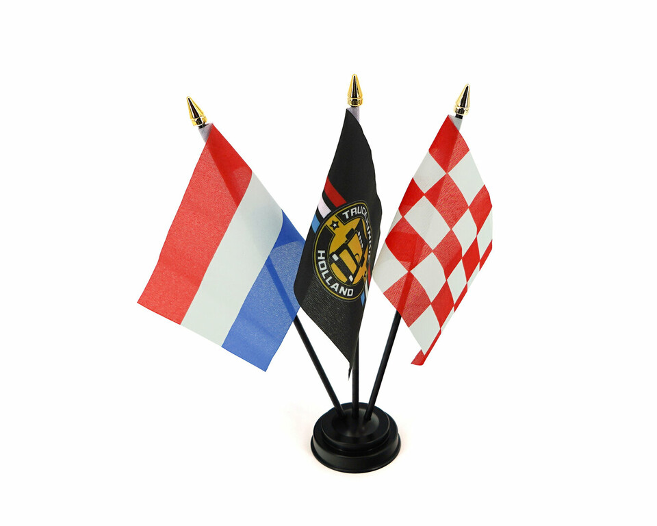 Drei Tischflaggen auf schwarzem Ständer mit goldenen Spitzen: Niederlande, Truckers Holland und rot-weiß kariert.