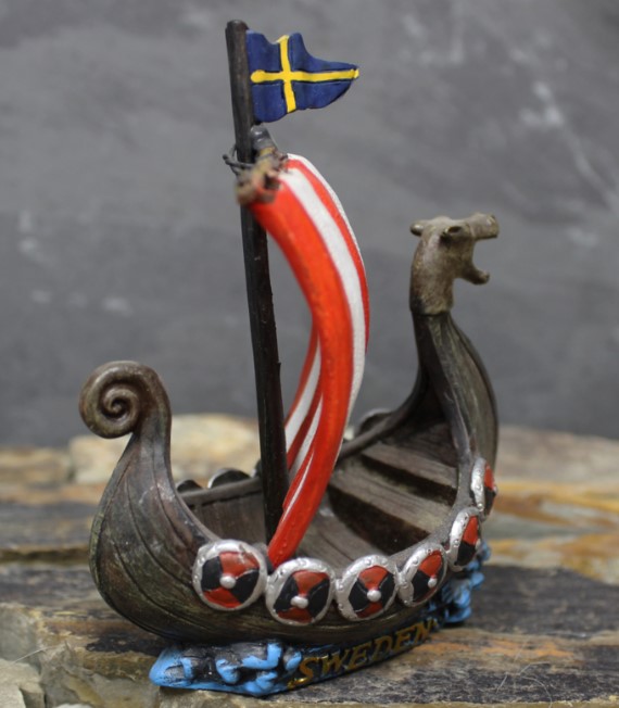 Detailgetreues Wikingerschiff mit rot-weißem Segel, schwedischer Flagge, Drachenkopf und Schilden. Auf dem Sockel steht 'SWEDEN'.