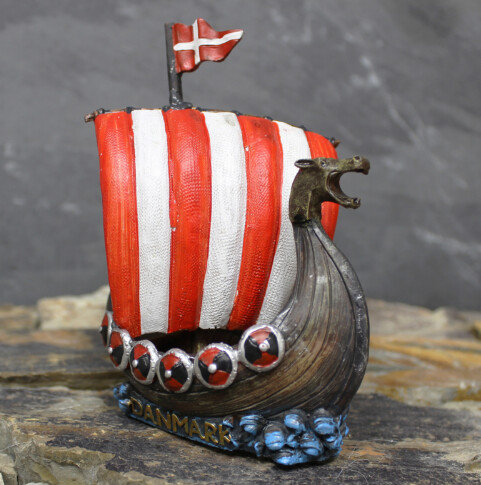 Dekoratives Wikingerschiff mit rot-weißem Segel, Drachenkopf und dänischer Flagge. Aufschrift "DANMARK".