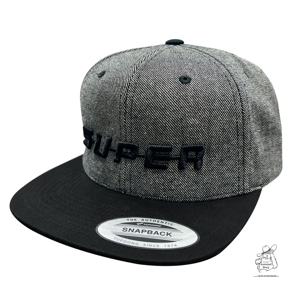 Dunkelgraue Snapback Cap mit schwarzem Schirm und schwarzem SUPER-Stick.