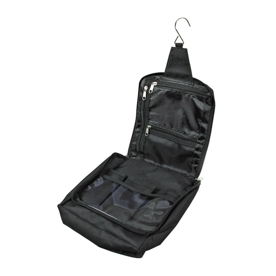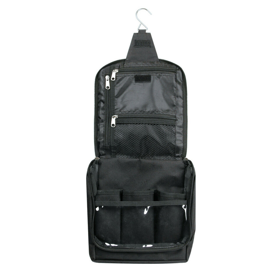 Offene schwarze Kulturtasche mit Haken, mehreren Reißverschlussfächern und Netztasche.