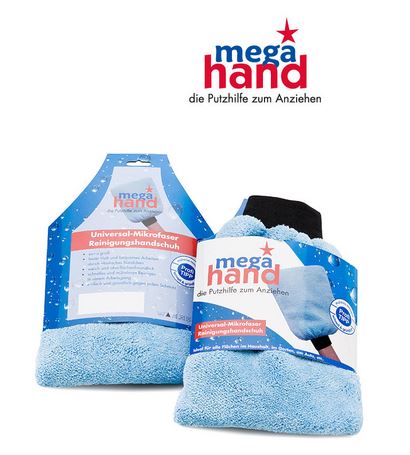 Hellblaue, flauschige Universal-Mikrofaser Reinigungshandschuhe von Mega Hand in der Verpackung.