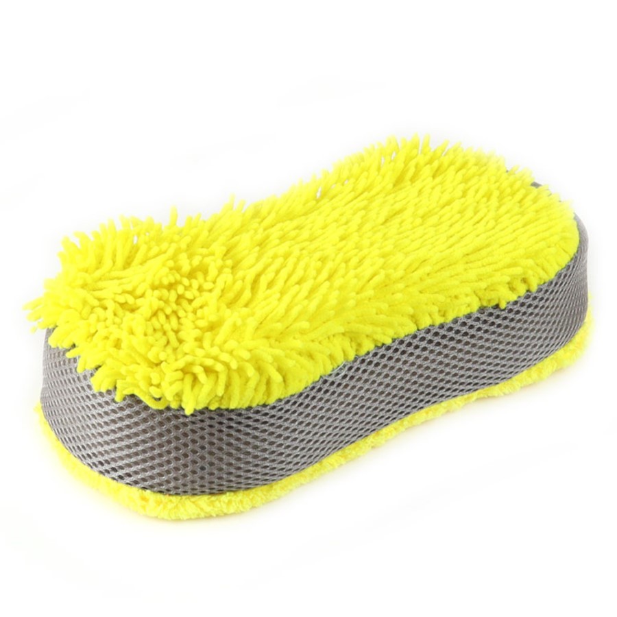 Gelber Mikrofaser Waschschwamm mit grauer Netzstruktur.