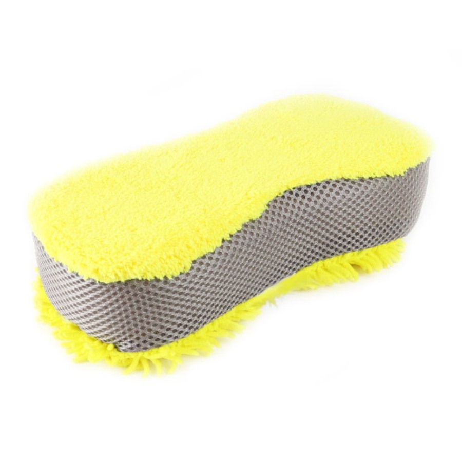 Gelber Mikrofaser Waschschwamm mit grauer Netzseite.