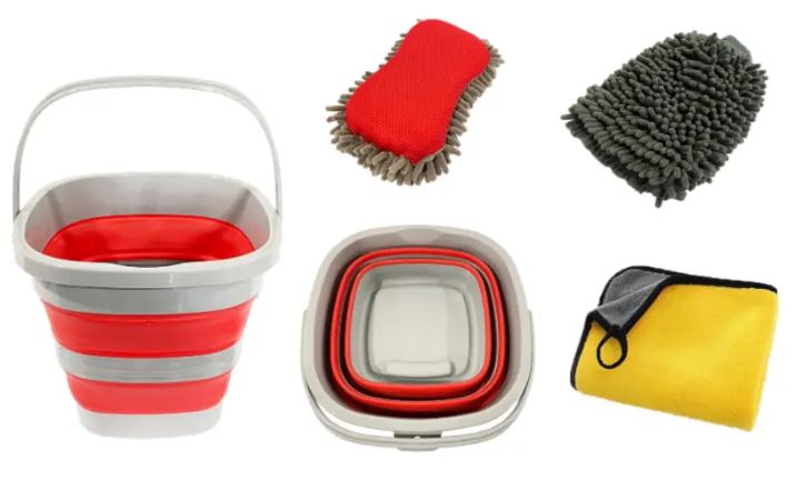 Komponenten des Autopflegesets: roter/grauer Falteimer, rotes Waschpad, grauer Waschhandschuh, gelbes Mikrofasertuch.