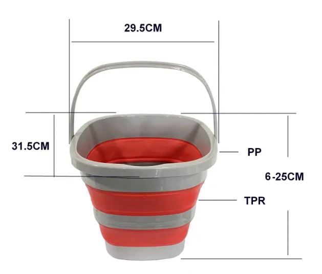 Ein faltbarer Eimer in Grau und Rot, aus flexiblem Material.