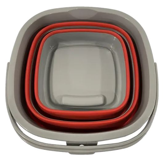 Grauer faltbarer Eimer mit rotem, flexiblem Innenteil.