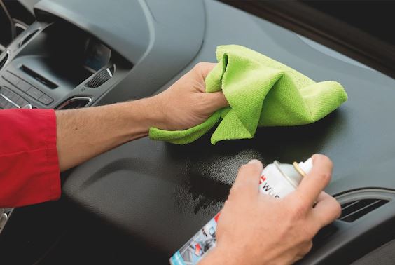 Eine Hand wischt mit einem grünen Würth Mikrofasertuch ein Auto-Armaturenbrett, während die andere Hand ein Reinigungsspray aufsprüht.