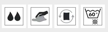 Pflegesymbole für Mikrofasertuch: Nassreinigung, Schmutzentfernung, Lufttrocknung und Waschen bei 60°C ohne Weichspüler.
