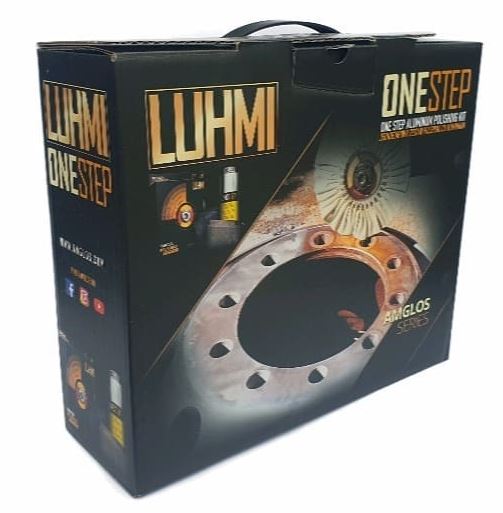 Schwarze Verpackung des LUHMI One Step Politur Sets mit Abbildungen von Politur und Polierscheibe.