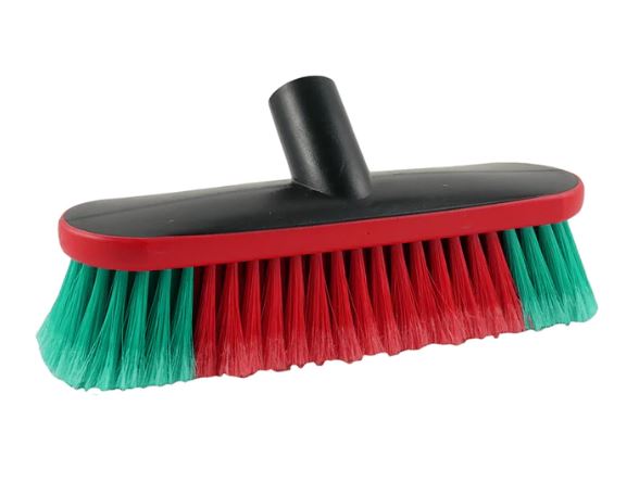Große Vikan LKW Waschbürste mit schwarzem Gehäuse, rotem Gummirand und weichen roten und grünen Borsten.