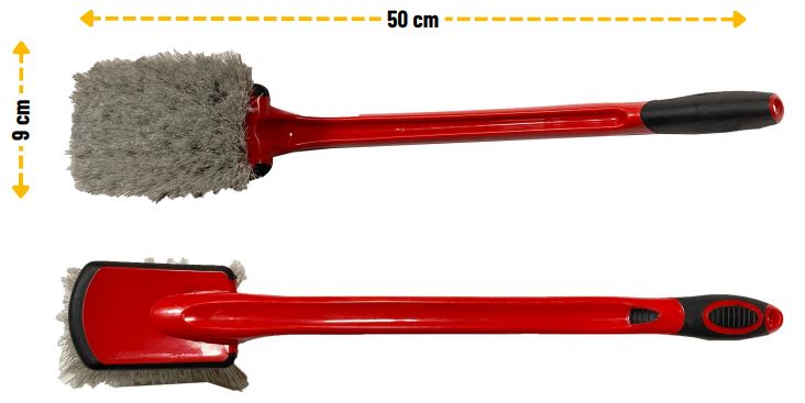Zwei Ansichten einer roten Waschbürste mit grauem Bürstenkopf, 50 cm lang und 9 cm breit.