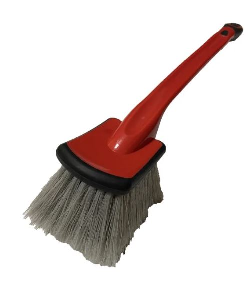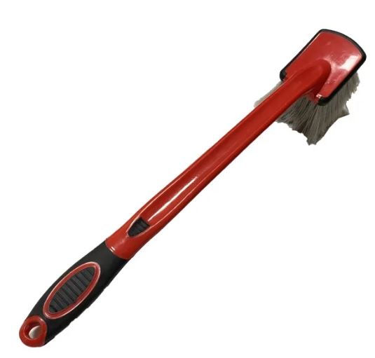 Rote Waschbürste mit schwarzem Griff und hellen Borsten auf weißem Hintergrund.