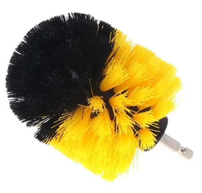 Runde Reinigungsbürste mit schwarzen und gelben Borsten und einem silbernen Metallanschluss.