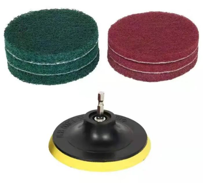 Reinigungsbürsten Set mit mehreren grünen und roten Reinigungspads und einem schwarzen Schleifteller.