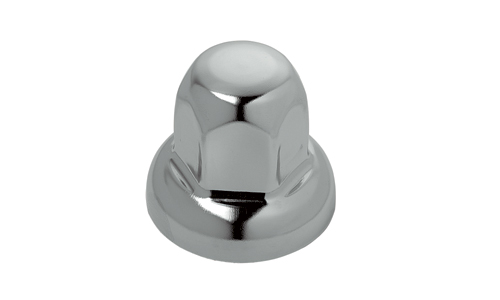 Eine glänzende Radmutterkappe aus Edelstahl auf weißem Hintergrund.