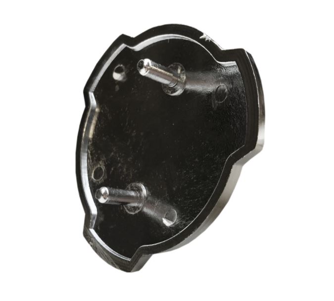 Rückansicht des DG Kühleremblems V8 aus silbernem Plastik mit Befestigungsstiften.