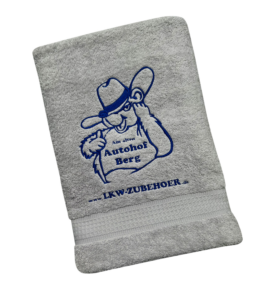 Graues Baumwollhandtuch mit blauem Autohof Berg Logo und den Schriftzügen "Am alten Autohof Berg" und "www.LKW-ZUBEHOER.de".