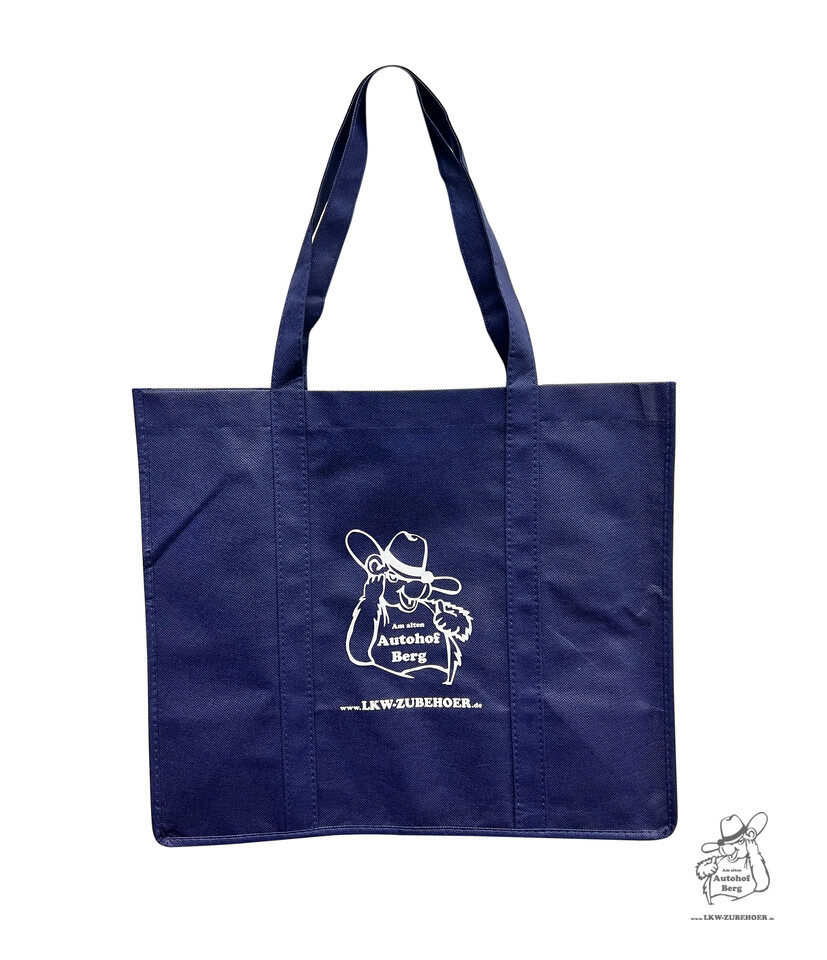 Dunkelblaue Autohof Berg Einkaufstasche aus Stoff mit weißem LKW-Zubehör Bären Logo