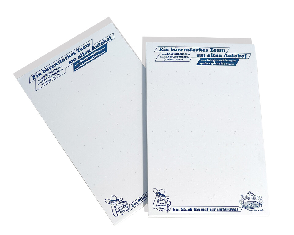 Zwei kleine weiße Notizblöcke mit blauem Aufdruck: "Ein bärenstarkes Team" und "Ein Stück Heimat für unterwegs".