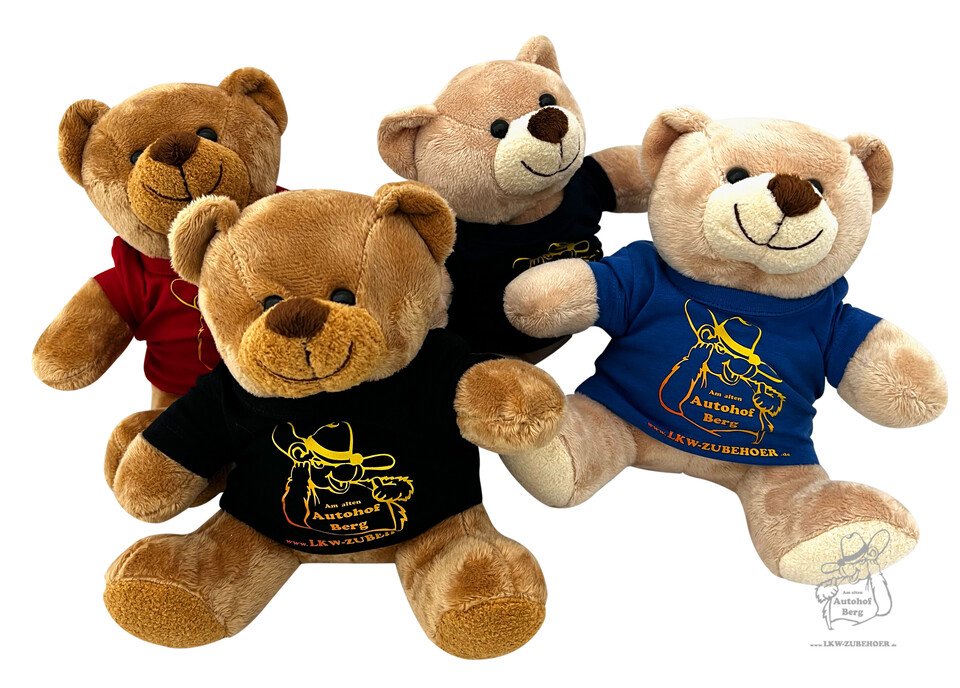 Mehrere braune Plüschbären mit roten, schwarzen und blauen T-Shirts, bedruckt mit 'Am alten Autohof Berg' und 'LKW-ZUBEHOER.de'.