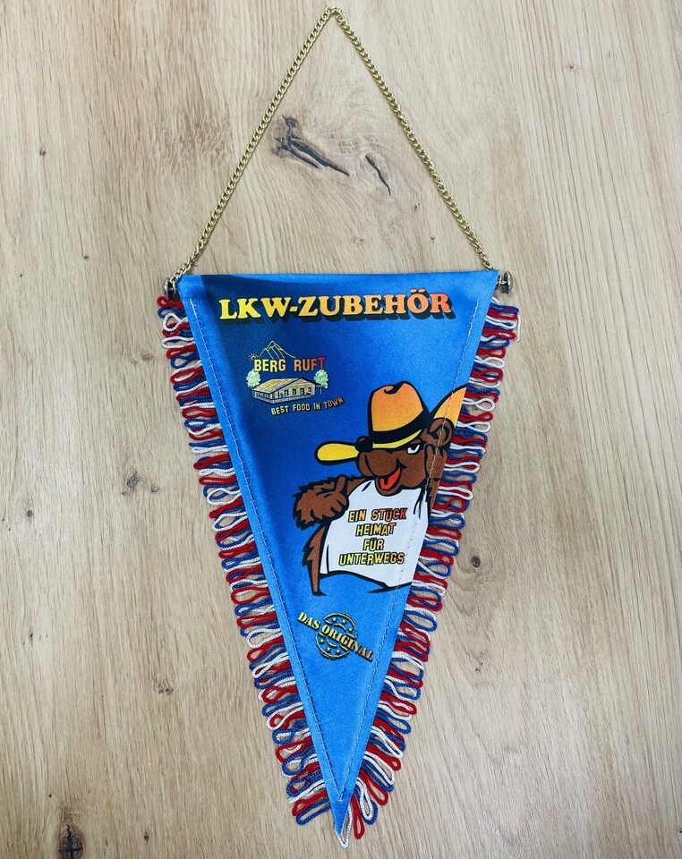 Blauer Wimpel "Berg" mit gelbem "LKW-ZUBEHÖR", Bären-Motiv mit dem Schriftzug "Ein Stück Heimat für Unterwegs". Mit rot/blau/weißen Fransen.