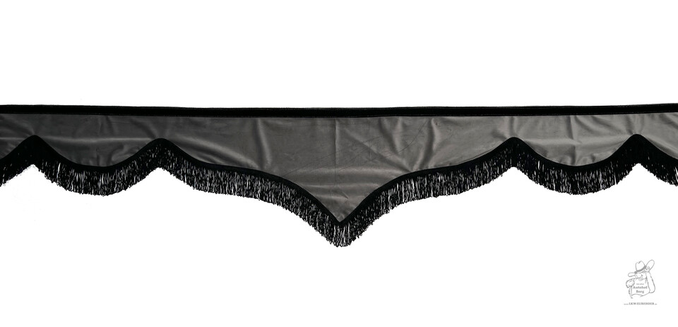 Dunkelgraue Velour Bordüre in V-Form mit schwarzen Fransen.