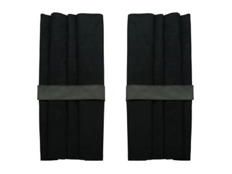 Ein Paar schwarze Bettgardinen aus Wildlederimitat mit Kunstleder-Rückhaltebändern.