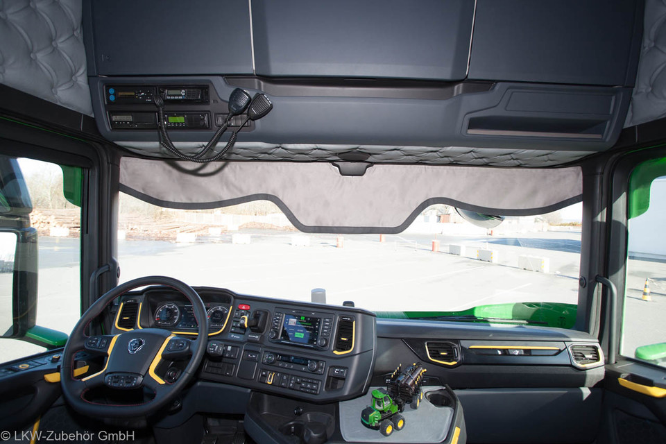 Helle Scheibenbordüre aus Polyester in Alkantara-Optik mit welliger Kante im LKW-Innenraum.