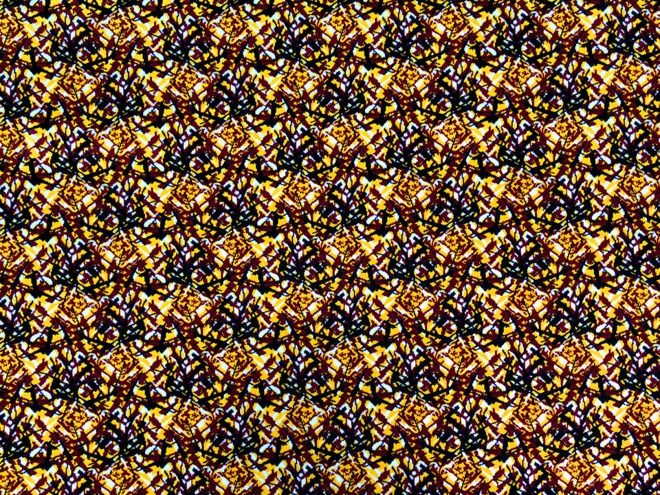 Das beigefügte Bild zeigt ein abstraktes, sich wiederholendes Muster in Gelb, Schwarz, Weiß und Dunkelrot.