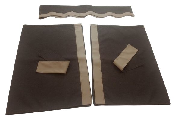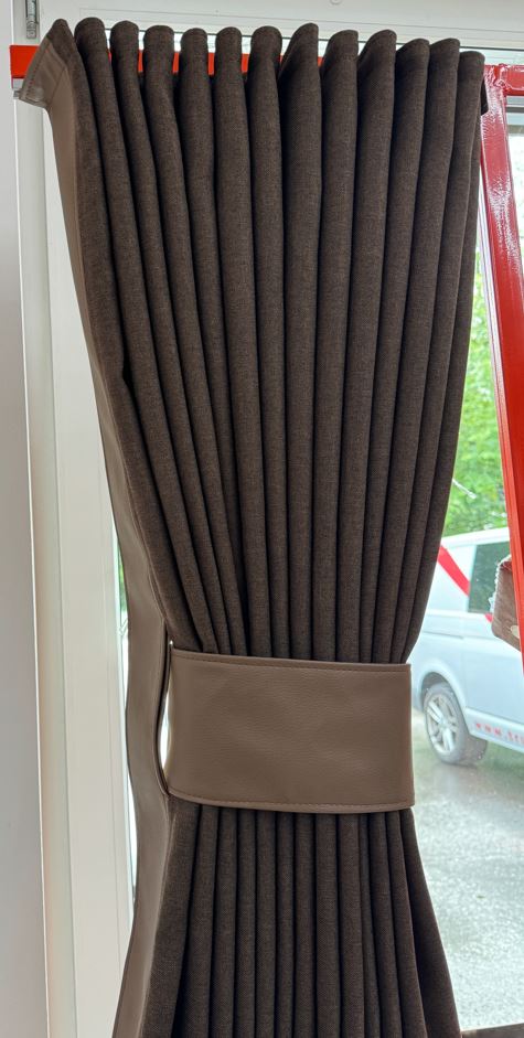 LKW Gardinenset aus dunkelbraunem Stoff mit beiger Kunstlederkante. Zeigt Bordüre, Rundumgardine und Rückhaltebänder.