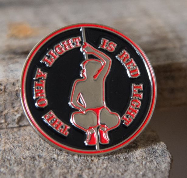Runder Scandi Pin mit schwarzem Hintergrund, rotem Rand und der Aufschrift "THE ONLY LIGHT IS RED LIGHT". Eine silberne Figur tanzt an einer Stange.