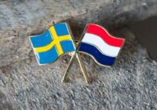 Gekreuzte Emaille-Pins: schwedische Flagge (blau-gelb) und niederländische Flagge (rot-weiß-blau).