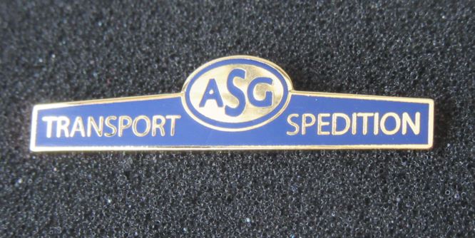 Blauer und goldener Scandi Pin mit 'TRANSPORT ASG SPEDITION' Schriftzug.