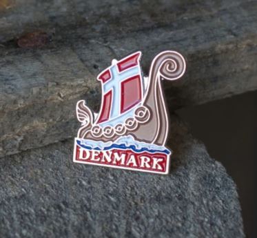 Metall-Pin in Form eines Wikingerschiffs mit rot-weißem Segel und blauen Wellen. Schriftzug DENMARK.