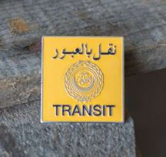 Quadratischer gelber Scandi Pin mit schwarzem "TRANSIT" und arabischem Schriftzug sowie silbernem Emblem.