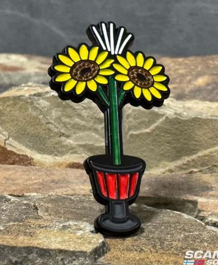 Scandi Pin Sonnenblume mit gelben Blüten und weißen Strahlen in einem rot-schwarzen Topf.