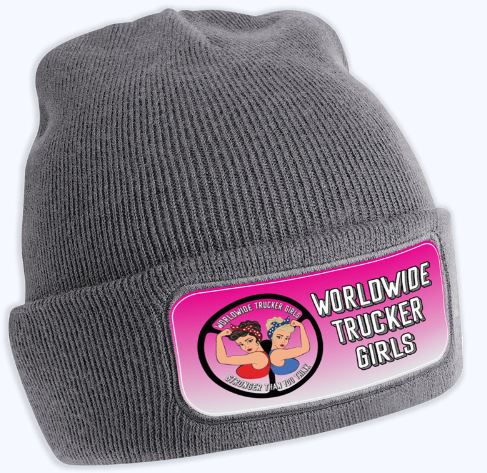 Graue Strickmütze mit pinkem Aufnäher, der zwei starke Frauen und den Text 'WORLDWIDE TRUCKER GIRLS' zeigt.