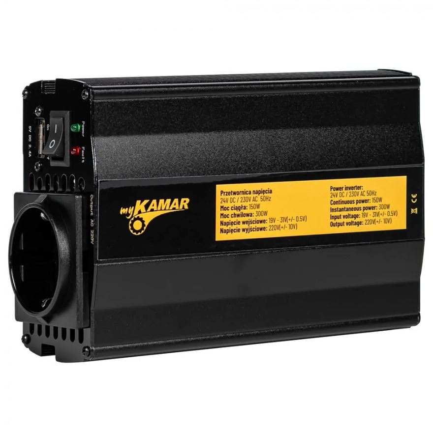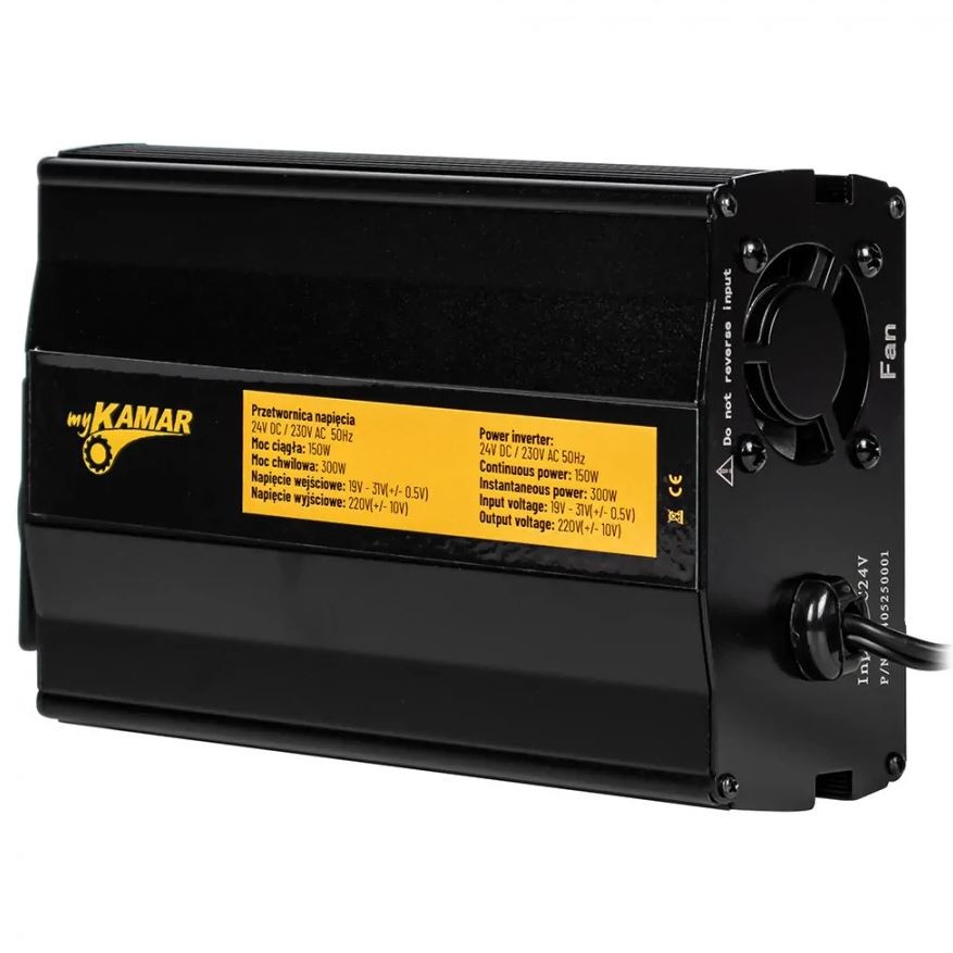 Schwarzer myKAMAR Spannungswandler mit Lüfter. Auf dem gelben Etikett sind 150W/300W Leistung sichtbar.