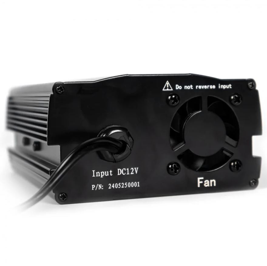 Schwarzer Spannungswandler mit Lüfter, Kühlrippen und Kabelanschluss. Aufschrift