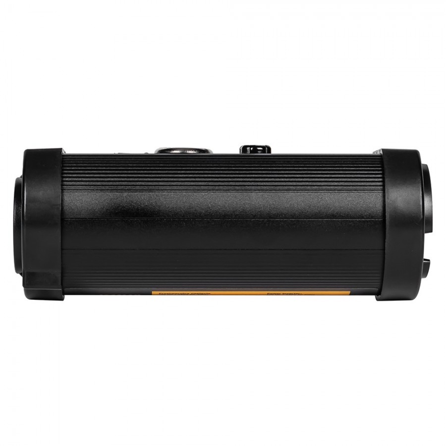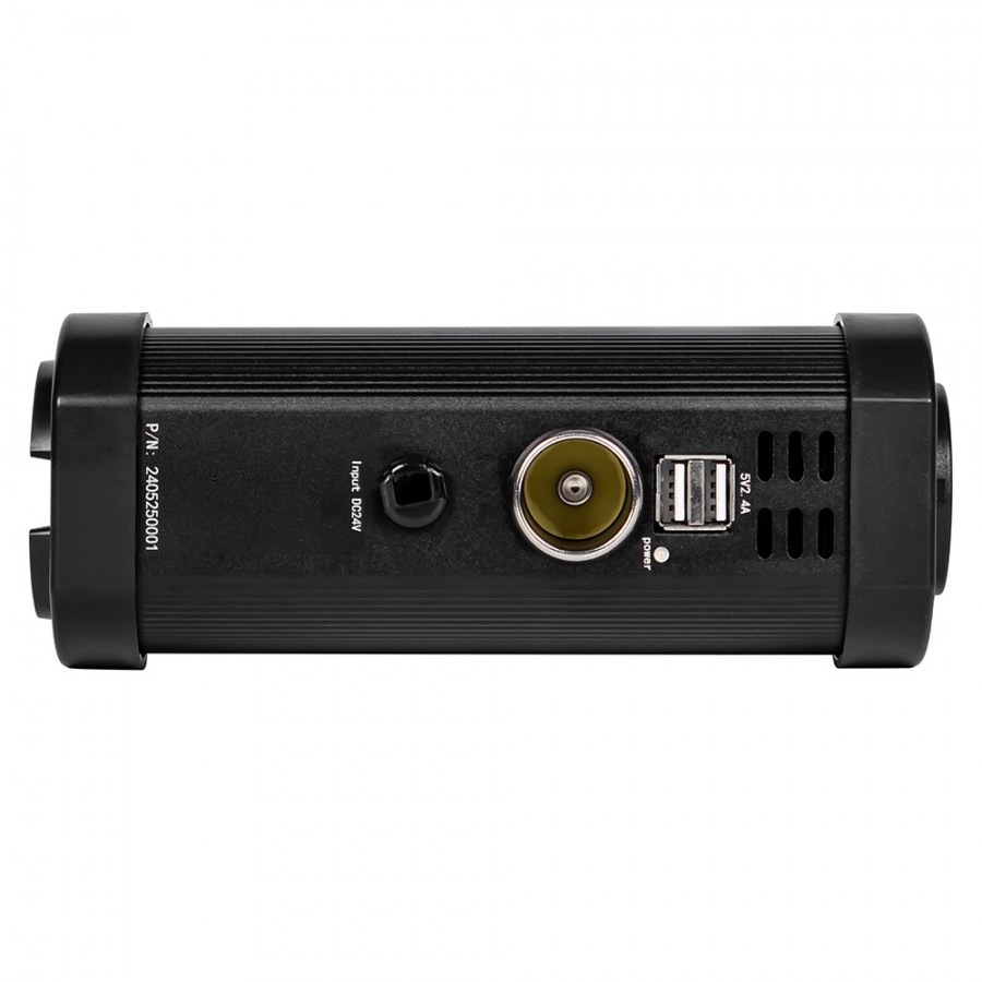 Schwarzer runder Spannungswandler mit Zigarettenanzünderbuchse, USB-Anschlüssen und Lüftungsschlitzen.