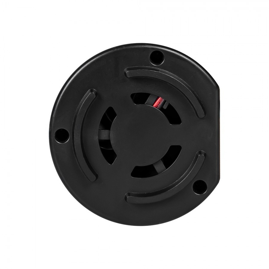 Runder, schwarzer Spannungswandler mit Lüftungsgitter und Befestigungslöchern. Rotes Kabel sichtbar.