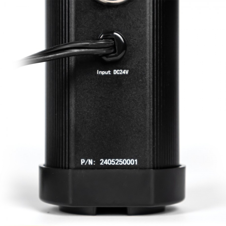 Schwarzer runder Spannungswandler mit Kabelanschluss und der Aufschrift 'Input DC24V'.