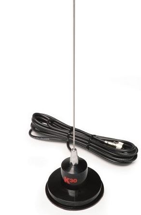 K30 CB Magnetfußantenne mit schwarzem Magnetfuß, Edelstahlstrahler und Kabel.