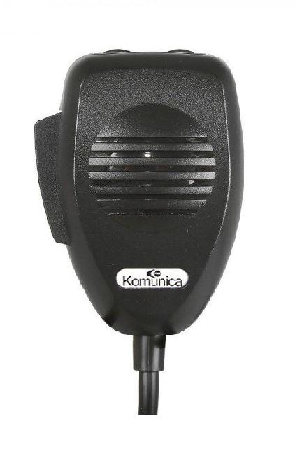 Schwarzes Komunica CB Handmikrofon aus Kunststoff mit Lautsprechergitter und PTT-Taste.