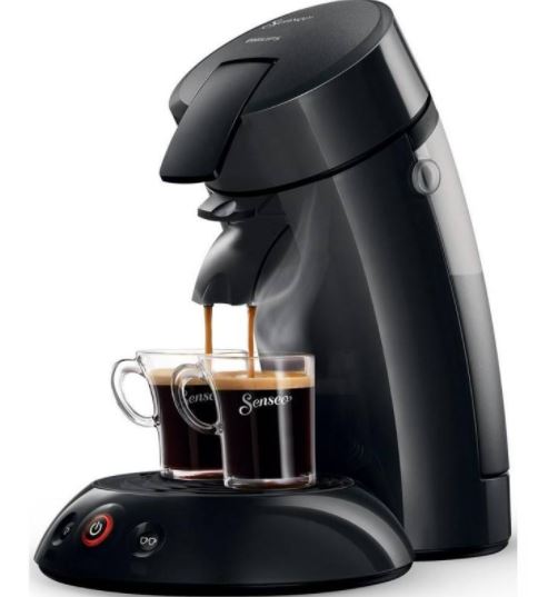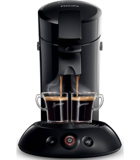Schwarze Senseo Philips Kaffeepadmaschine, die Kaffeetassen befüllt.