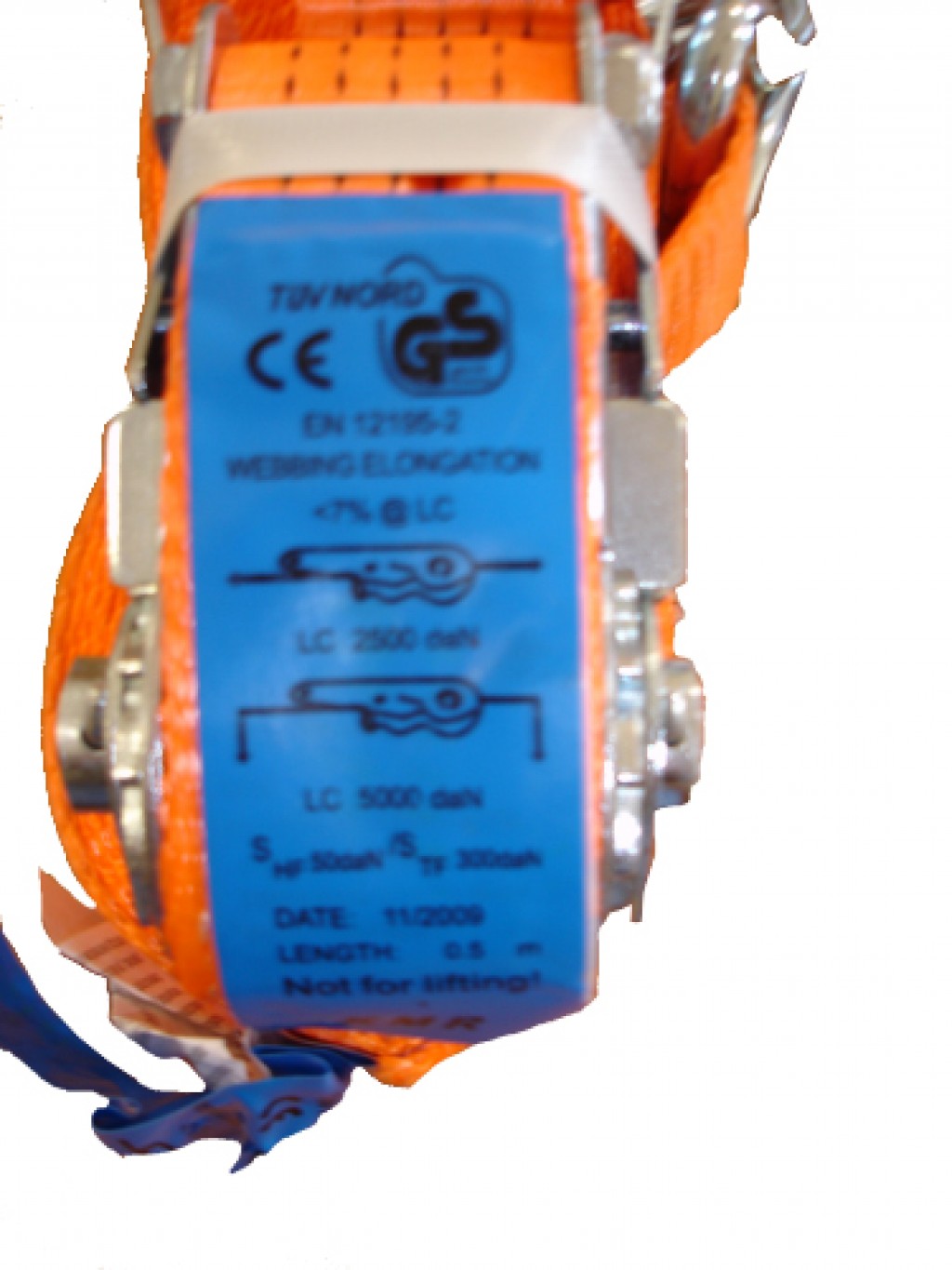 Nahaufnahme eines orangefarbenen Spanngurts mit Ratsche und blauem TÜV NORD GS Prüfsiegel.